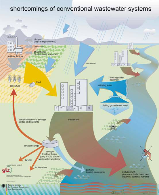 全國每天約有1億噸污水直接排入水體,全國七大水系中,一半以上河段水質受到污染,1/3的水體不適于澆灌,50%以上城鎮(zhèn)的水源不符合飲用水標準。造成以上問題,除有工業(yè)污水的因素外,生活用水也是重要因素。其中使用沖水馬桶,一人一年僅用來沖走500公斤尿液和50公斤大便就需耗水15000公斤。全世界每年消耗1.6億噸化肥的同時,卻把相當于 0.5億噸肥效的糞便排到水體里。占市政污水總量不過1%的尿液卻帶給了水體80%的氮及50%的磷,成了水體富營養(yǎng)化和藍藻暴發(fā)的直接推動力。